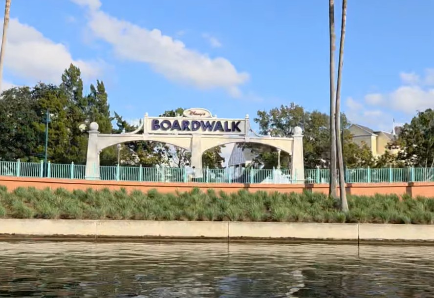 The bridge approaching the Boardwalk area as well as the Boardwalk signage from the water.