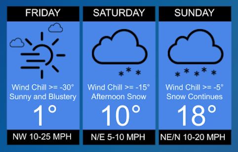 Note that the predicted high is supposed to be 1 degree with a wind chill of up to -30 degrees. If you need to be out and about tomorrow, make sure that you car’s gas tank is full or at the very least over the halfway mark. This will help to prevent gas line freeze up and will also offer you engine running time should you become stopped in traffic and need that heat.
