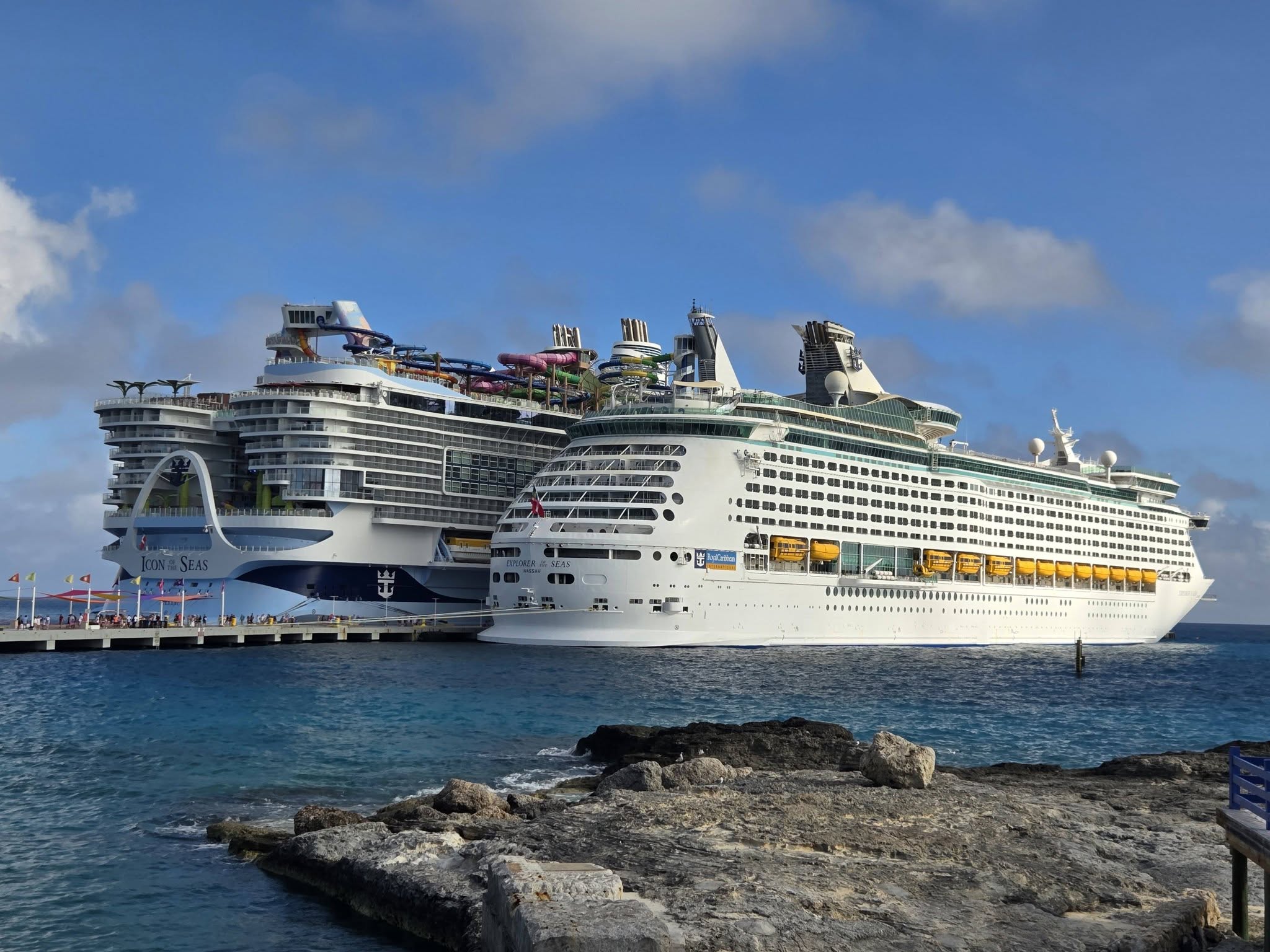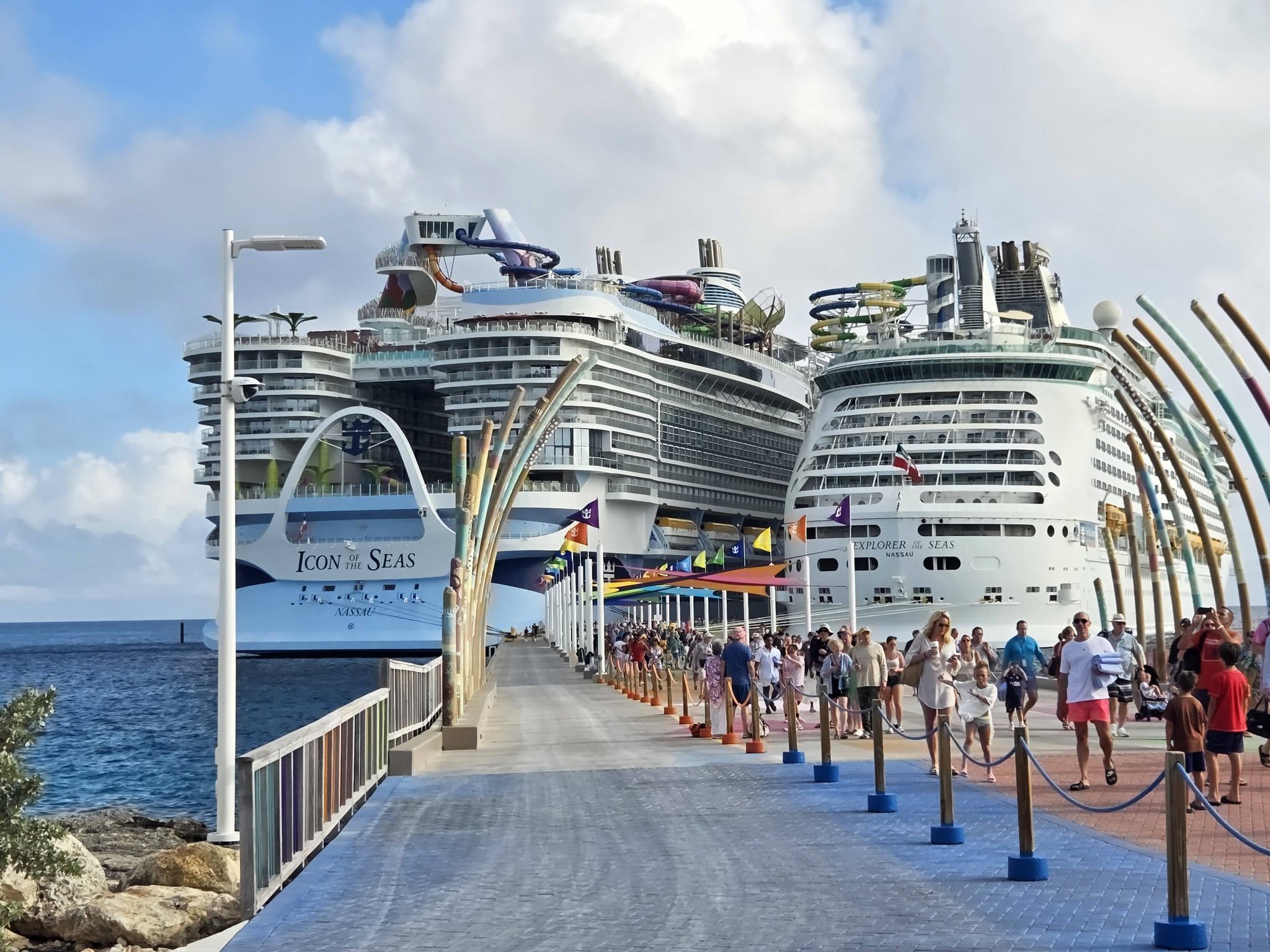 We shared the pier with the Icon of the Seas.  Our ship looked puny next to her.  The Explorer of the Seas has a capacity for 3,286 (double occupancy) and can hold up to 4,290 guests at maximum capacity. The ship also carries approximately 1,185 crew members.  The Icon of the Seas (presently, the Icon series of ships are the largest in the world) has a maximum capacity of 7,600 passengers. When accounting for double occupancy, the ship holds 5,610 guests. Including the 2,350 crew members, the total capacity of the world’s largest cruise ship is nearly 10,000 people.  Wow!