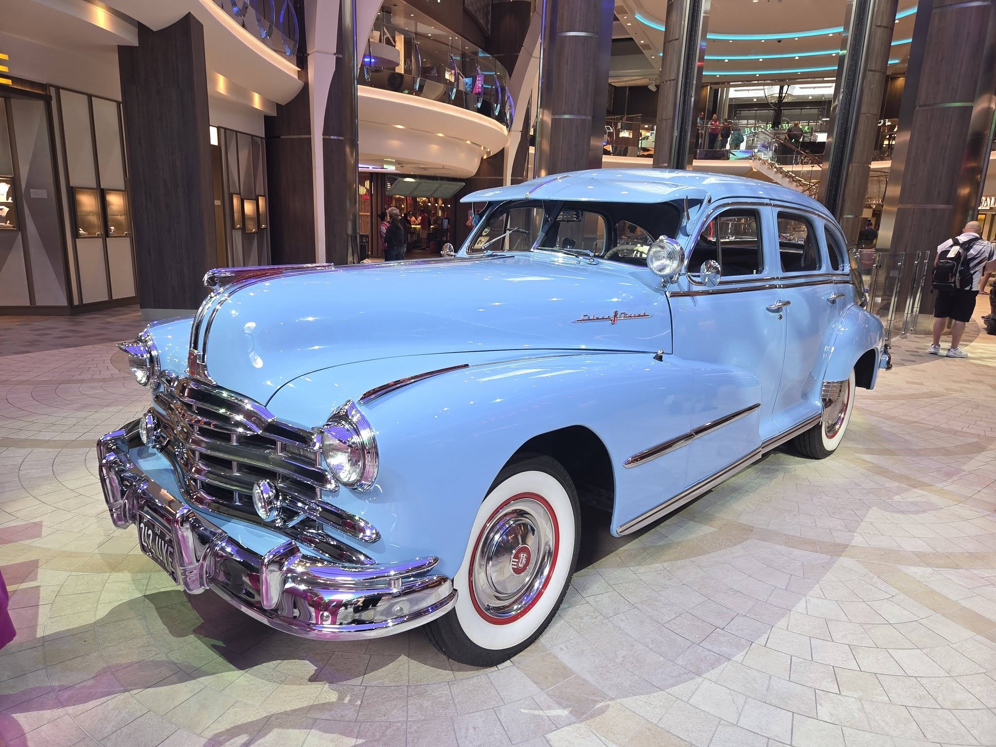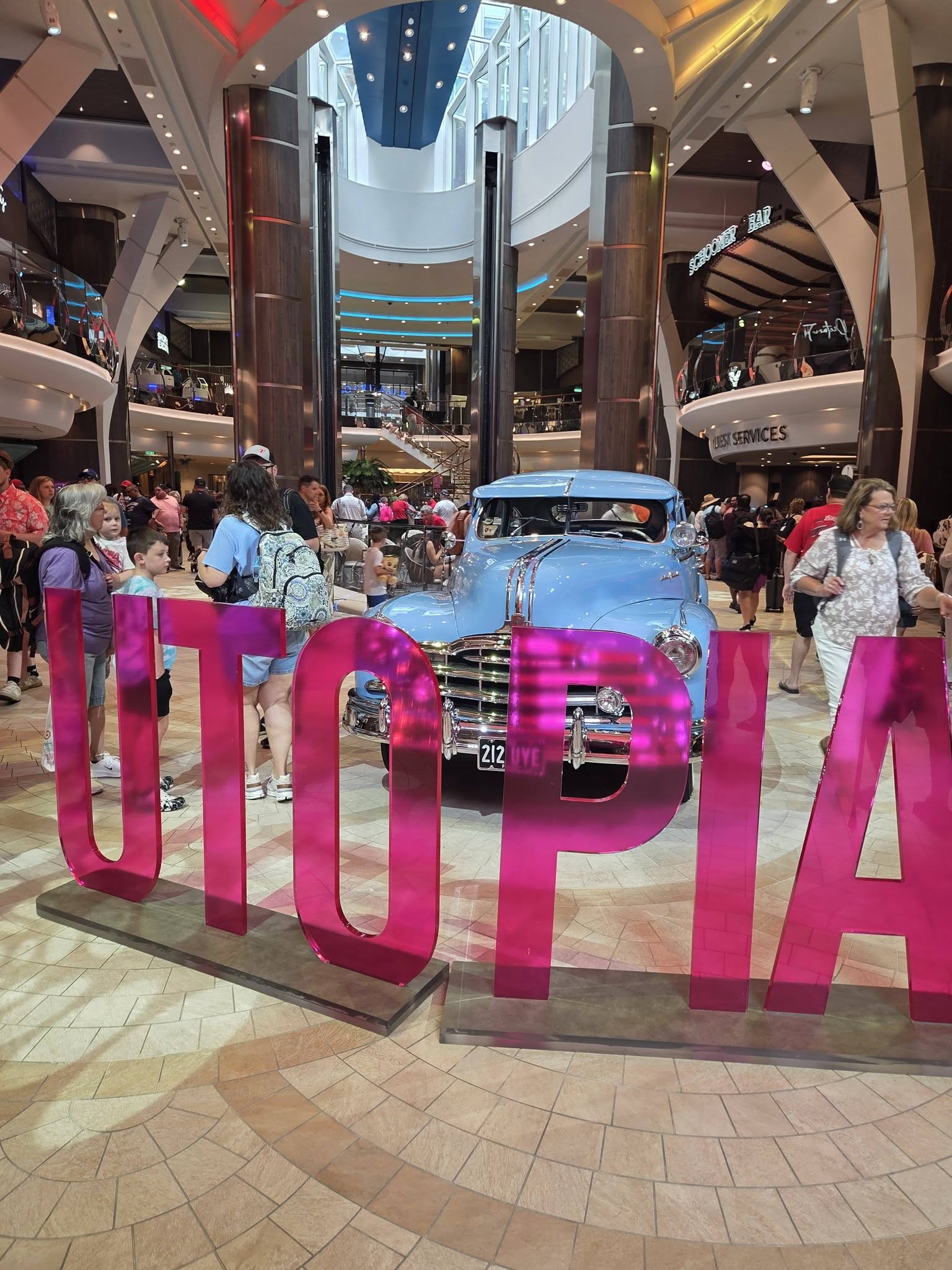 I boarded Utopia of the Seas at 10:15 a.m. today. The registration process was super fast! When I got to the promenade, I saw “the car”. All of Royal’s larger ships of cars in their main promenade.