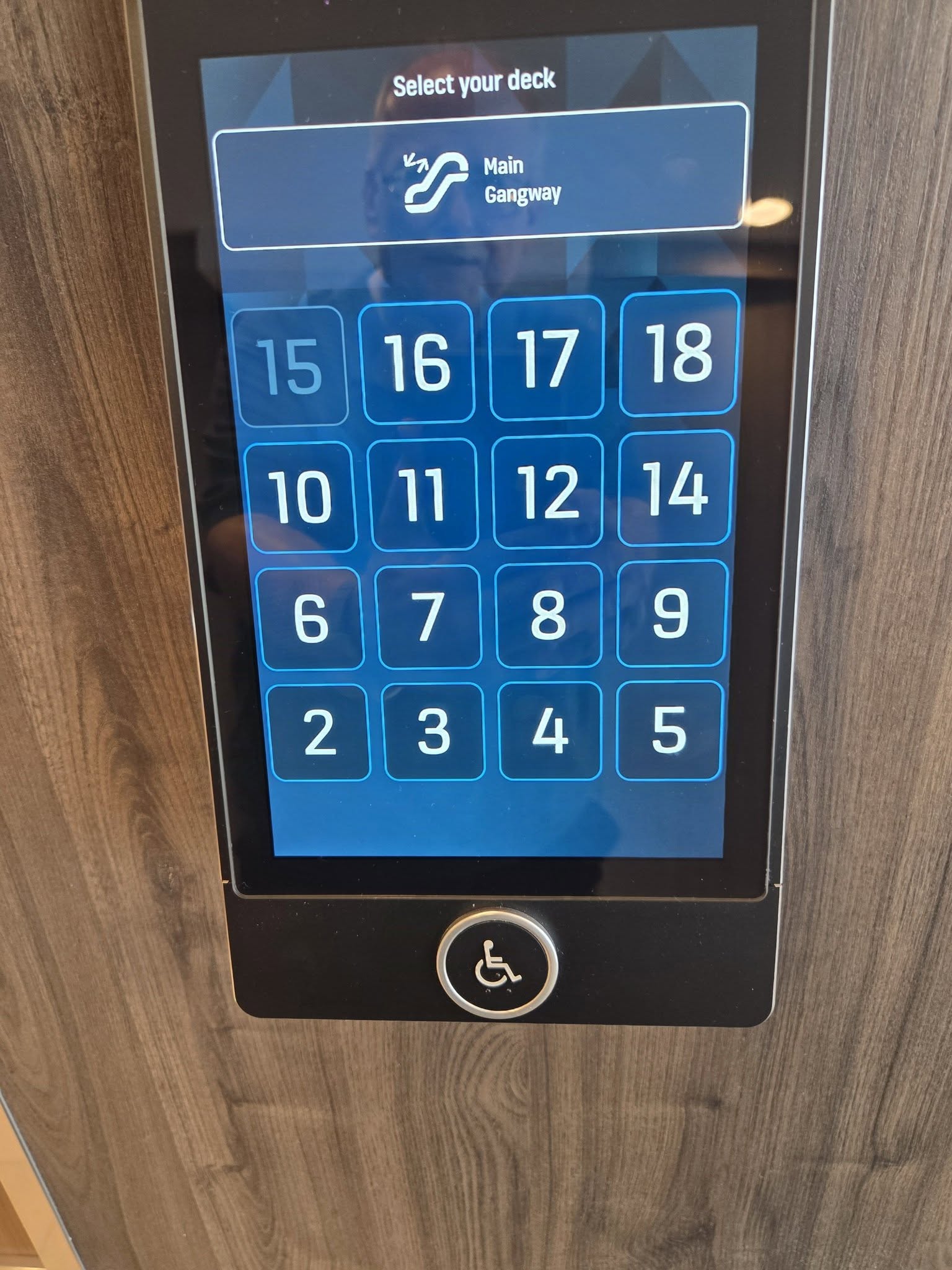 When they announced that the rooms were ready, I went up to my room using Royal’s newer “destination elevators. You press the floor you want and it tells you what elevator (A – F) to use. No buttons inside the elevator. Just board and zoom to the prearranged floor(s).