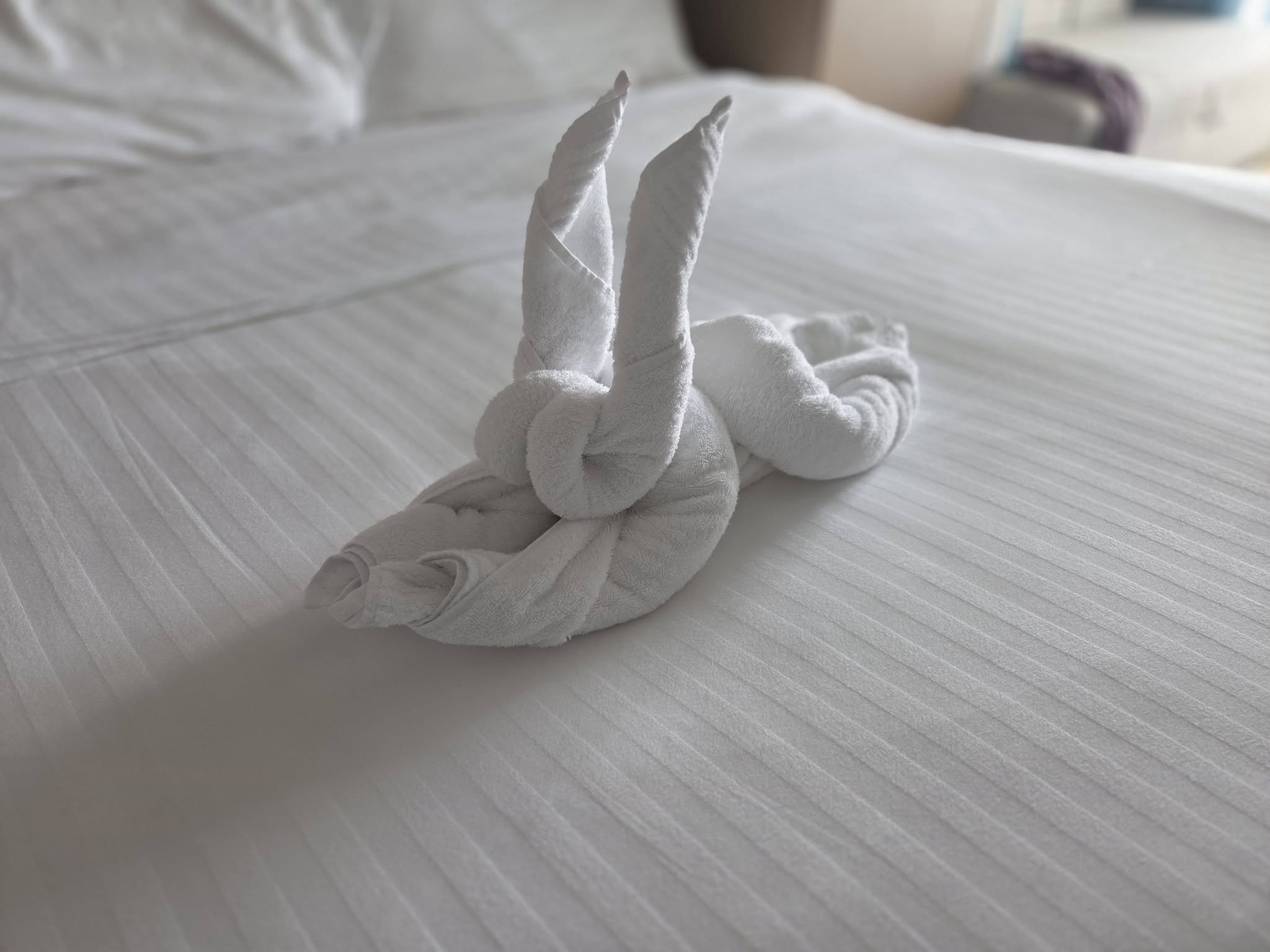 After the meeting, I went down to the promenade to get a glass of pop and visit around a little bit with crew.  When I came back, I saw that my cabin attendant had come and gone, just like a ninja.  Thought for the day, “you’re no bunny till some bunny loves you.”