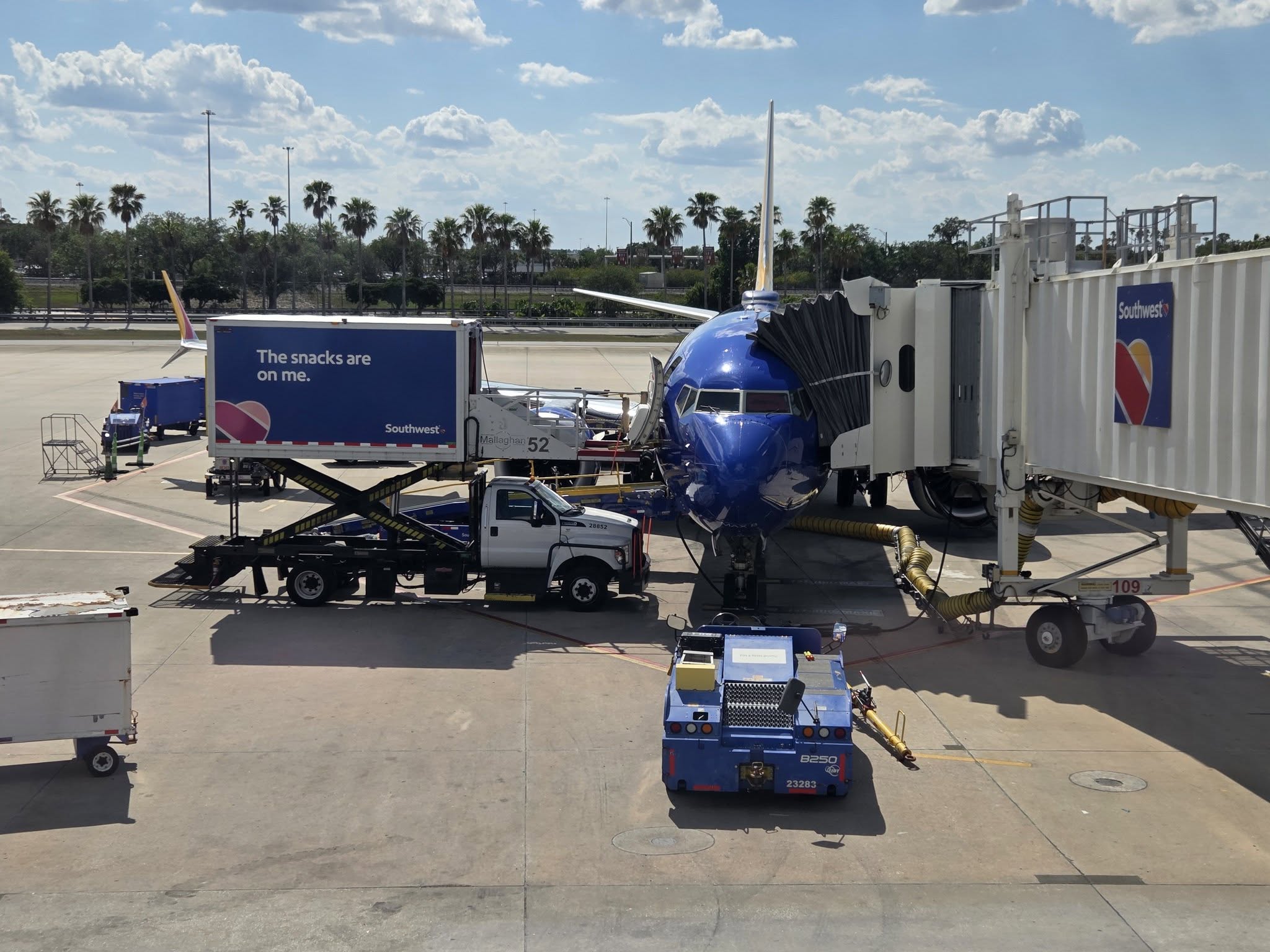 Finally, I saw our plane coming to the jet ramp to get serviced. They loaded up the snacks and then loaded up the snack-eaters. 🙂